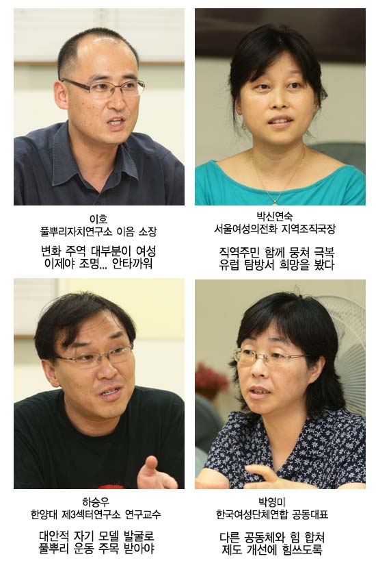 하승우: 유럽은 사회민주주의 전통에서 이런(풀뿌리 운동) 공동체들이 유지, 발전돼 왔는데 한국은 자본주의 시스템에서도 시장경쟁주의로 가고 있고 정치적으로도 보수적인 국가다. 유럽의 모델을 한국적인 경험으로 재해석하기 위해서는 이 부분을 어떻게 극복할지 내부적인 고민이 필요하다.
