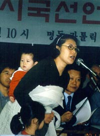10일 오전 명동성당 카톨릭회관에서 열린 '반전평화 시국대선언' 대회에 참석한 환경운동연합 회원 신주희 씨는 자유발언 시간을 통해 평화를 눈물로 호소했다. 그의 등에는 갓 1돌을 지난 듯한 아이가 업혀있었고, 4살정도 된 여자 아이가 연단에 따라나와 어머니가 흘리는 눈물을 지켜보고 있었다.