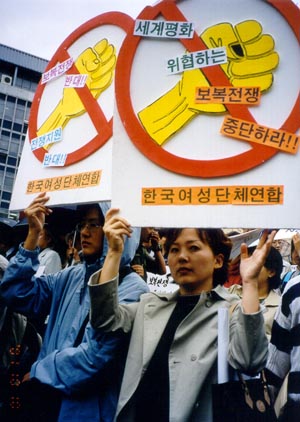 "우리는 여성과 아동, 노인 등 모든 사회적 약자들을 희생양으로 하는 전쟁과 폭력을 단호히 반대하며, 지금이라도 전세계의 평화와 인권을 사랑하는 시민들의 목소리에 귀를 기울여 전쟁을 중지할 것을 강력히 촉구한다. 또한 우리는 한국 정부가 어떠한 경우에도 군사적 행동에 참여해서는 안 될 것임을 밝히며, 부시 행정부의 전쟁 범죄 행위에 대한 모든 형태의 지원 계획을 즉시 철회할 것을 요구한다. 더 나아가 김대중 대통령이 노벨평화상 수상자로서 폭력과 보복 전쟁의 악순환의 고리를 끊기 위해 세계의 '지도자들'에게 평화의 메시지를 보내기를 촉구한다."