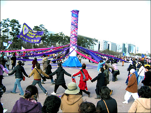 | ▲ 상생의 탑을 중심으로 참가자들이 길쌈짜기와 강강수월래를 하면서 즐거워 하고 있다. ⓒ 한국여성단체연합 | |