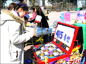 | ▲ 이날 펼쳐진 20개의 시민난장 중 총선여성연대가 주관한 "부패정치""금권선거" 때려잡기 한마당 ⓒ 한국여성단체연합 | |