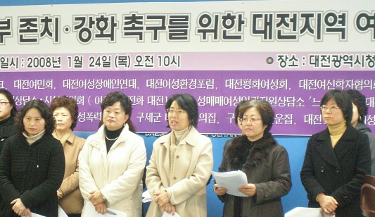 이명박 당선인은 후보시절인 지난 11월에 여성정책토론회에 참석해 여성가족부의 존치를 약속했으나, 채 두 달이 지나지 않아 당선이 된 후 대통령직인수위원회는 지난 1월 16일(수), 여성가족부 통폐합을 명시한 정부조직개편(안)을 확정·발표했다. 이에 우리 대전지역 여성계는 여성유권자와 약속을 무시한 채 여성가족부를 통․폐합하려는 이명박 당선인과 대통령직인수위원회에 대해 강한 분노와 우려를 표명하며, 여성가족부 존치·강화를 강력히 촉구한다.