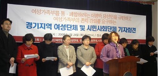 남길현 경기여성단체연합 사무국장의 사회로 진행된 기자회견에서는 "이명박당선인은 지난해 11월 여성정책토론회에서 여성가족부의 존치를 약속했음에도 불구하고 당선이후 불과 3개월도 지나지 않아 약속을 어기는 것은 국민을 우롱하는 처사이다" 라고 밝히고 , 여성가족부의 존재가 경기도를 비롯한 지방자치단체 여성정책의 발전에 크기 기여하였으며 남녀의 정책의 불균형이 존재하고 있는 우리사회의 현실로 보았을때 여성가족부의 역할이 여전히 필요함에도 불구하고 여가부를 통폐합하려는것은 여성정책이 다시 거꾸로 가는 심각한 문제라고 밝히면서 기자회견을 개최하는 의미를 설명하였다. 또한 그간의 여성가족부 존치를 요구하는 여성들의 활동경과를 보고하였다.