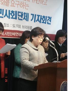 경기여성단체연합 장순화 대표는 기자회견문 통해 여성의 지위는 사회에서 여전히 낮은 수준이며 성평등의 가치가 사회정책의 기본가치가 되면서 섬세한 전략을 수립해야하고 여성과 가족에 대한 지원서비스를 효율적으로 추진하기 위해서도 여성정책전담부서를 존치시키고 기능을 강화해야한다고 밝혔다. 또한 여성가족부의 통폐합은 경기도를 비롯한 지방자치단체의 여성정책의 발전적 성과를 물거품으로 만드는 것이며 여전히 사회적 자원이 부족한 경기지역의 여건으로 볼때 반드시 존치 강화를 통해 여성가족정책의 발전히 절실하다고 주장하였다. 이명박당선인은 책임있는 자세로 국민과의 약속을 지칠것을 강력히 요구하며 각 정당에게는 4월총선시기에 정부조직개편(안)을 반대하는 정당과 후보에게 아낌없는 지지를 보낼것을 밝혔다.