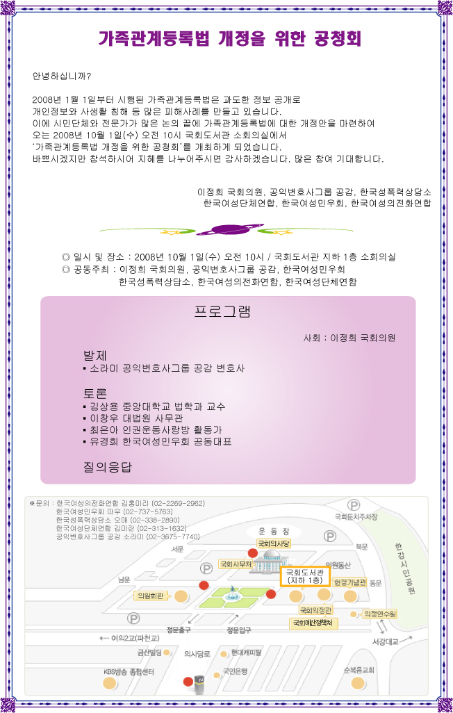 | » | 가족관계등록법 개정을 위한 공청회 | 2008.09.24 |