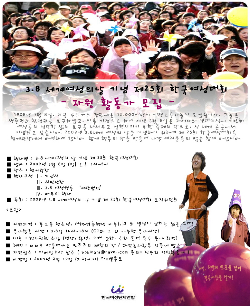 | 120 | 제25회 한국여성대회 <여성이 만들어요, 빈곤과 폭력없는 행복한 세상!> | 2009.02.18 |
