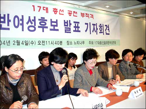 총선여성연대는 16대 국회가 여성들의 불평등과 차별을 해소하기 위한 노력에 기여하지 못했다는 점을 비판하고, 국회 회의록, 양성평등관련 법안에 대한 찬반 의견조사, 기타 여성관련 비하 발언등을 분석하여 공천반대 의원명단을 제시하고, 사회 개혁과 성평등 의식을 갖춘 후보 공천을 촉구하였다.