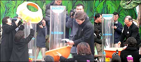 | ▲ 장상 이화여대 전총장, 박영숙 여성재단 이사장, 강지원 변호사(좌로부터)가 여성의 정치연도를 상징하는 기부온도계에 여성성을 상징하는 상징물과 기금을 투척하는 이벤트를 하고 있다. ⓒ 한국여성단체연합 | ||