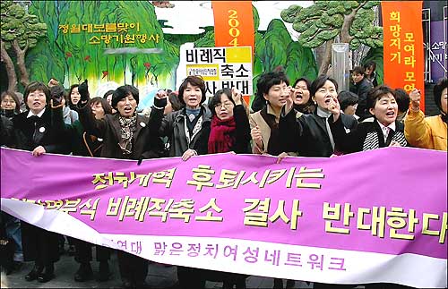 또한 이날 기금조성 이벤트가 끝난 직후에는 여성의 정치참여를 배제하고, 당리당략에 골몰하여 비례직 축소를 획책하는 국회를 질타하는 맑은여성네트워크 회원들과 총선여성연대 회원들의 기습적인 시위가 있었다. 이날 발표된 성명서 전문은 다음과 같다.