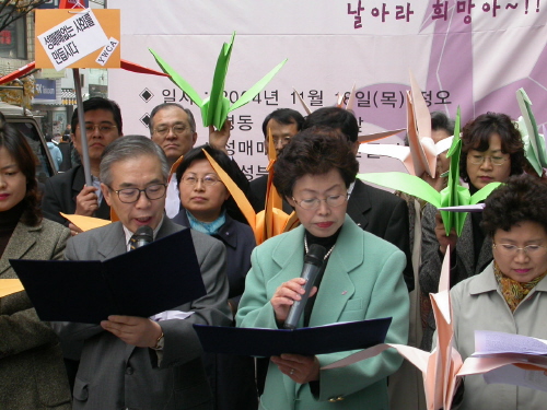 | ▲ 성매매피해여성보호를 위해 255개 시민단체들이 모여 결성된 '성매매없는 사회만들기 시민연대' 발대식 및 캠페인 장면(2004년 11월 18일) ⓒ 한국여성단체연합 | |
