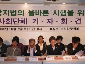 | ▲ 2004년 11월 9일에 열린 '성매매방지법의 올바른 시행을 위한 시민사회단체 기자회견' 장면. 기자회견에는 강지원(변호사, 어린이청소년포럼 대표), 박영숙(여성환경연대 상임으뜸지기), 서주원(환경운동연합 전사무총장) 등 많은 시민사회단체 인사들이 참여하였다.
