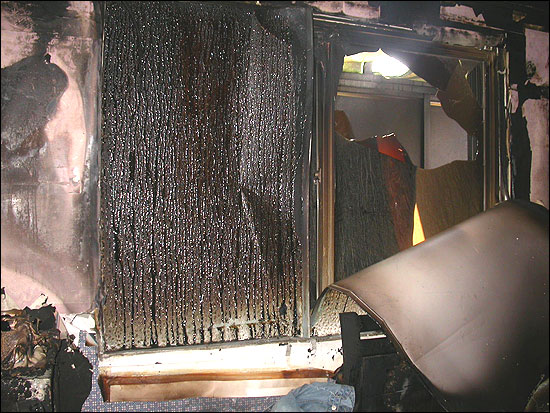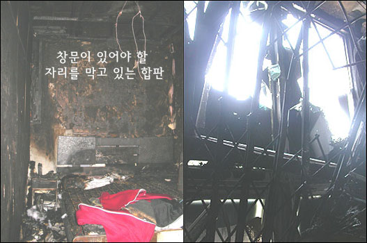 | ▲ 화재건물 4층에서는 합판이 아니라, 철재로 된 창문 막이가 휘어져 있다. ⓒ 한국여성단체연합 | ||