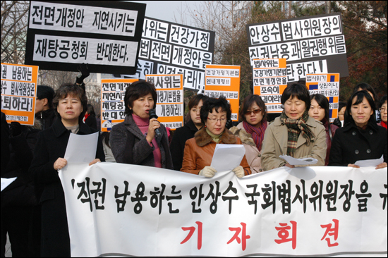 건강가정기본법 전면 개정을 촉구하는 전국 527개 여성·시민사회·사회복지계는 개인적인 친분에 따라 일부단체의 반대 여론만을 선별적으로 수렴한 채 법안 개정을 지연시키는 안상수 법사위원장을 강력히 규탄한다. 법사위는 공청회 계획을 즉시 철회하고 전면개정안을 조속히 의결해야 한다.