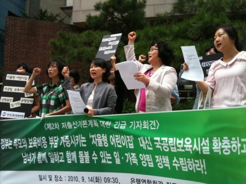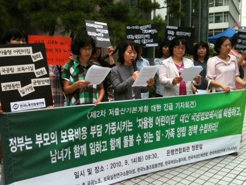 이날 기자회견은 저출산기본계획 공청회가 열리는 날, 공동육아와공동체교육, 한국노총, 민주노총, 여성연합등이 참여한 가운데 제2차 기본계획에는 '부모부담 가중시키는 자율형 어린이집 철회 대신 국공립보육시설 확충, 남녀가 함께 일하고 함께 돌볼 수 있는 일가족 양립정책 수립'을 요구하기 위한 것이다.