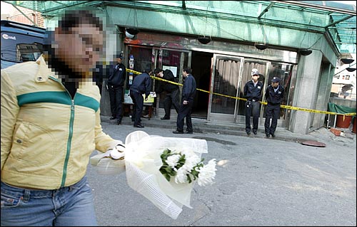 | ▲ 성매매 업소 여성 5명이 사망한 서울 성북구 하월곡동 미아리 집창촌에서 28일 오후 한 여성이 국화꽃을 들고 화재현장 앞을 지나고 있다. ⓒ 오마이뉴스 권우성 | ||