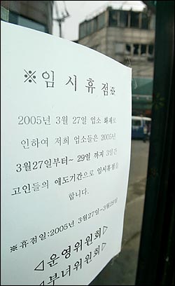 | ▲ 회재가 발생한 건물 건너편 업소 입구에 희생자들을 애도하는 뜻으로 27일부터 3일간 휴점한다는 안내문이 붙어있다. ⓒ 오마이뉴스 권우성 | ||