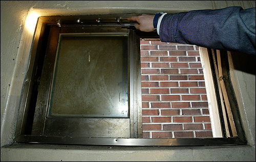 | ▲ 쇠창살 흔적 외부와 통하는 창문에는 세로로 설치되었던 쇠창살의 흔적이 그대로 남아 있다. ⓒ 오마이뉴스 권우성 | ||