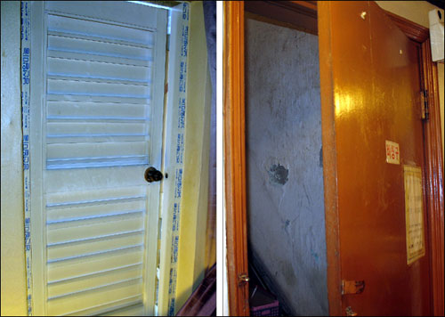 | ▲ 미아리 텍사스촌의 다른 업소에는 1층과 2층 연결통로와 옥상로 연결되는 비상구가 눈에 잘 띄는 곳에 있었다. 왼쪽이 1,2층 연결 복도의 것이고 오른쪽이 옥상 연결 비상문. ⓒ 2005 강이종행 | ||