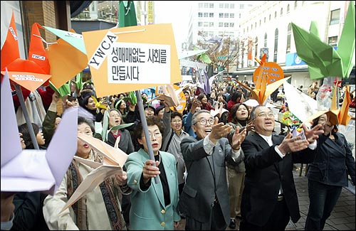 이강실 한국여성단체연합(여성연합) 공동대표, 박홍근 한국청년연합회(KYC) 대표, 김상근 반부패국민연대 대표, 이석태 민주사회를위한변호사모임(민변) 회장, 강지원 변호사, 이학영 한국YMCA전국연맹 사무총장 등 '성매매없는 사회만들기 시민연대'(이하 시민연대)의 공동대표단이 이 기구의 발족을 알리며 종이학을 날린 것.