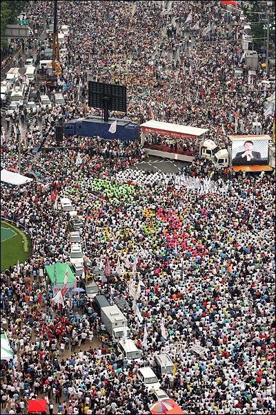 먹으면 안되는 위험한 고기를 국민이 결코 피할 수 없도록, 무차별 개방하고도 ‘성공한 협상’이라고 우기다가, 촛불이 타오르자 배후가 있다고 몰다가, 그것도 안되니까 ‘추가협상’이라는 거짓말을 추가로 꾸미고, 백약이 무효한 상황에 이러르서도 원천봉쇄, 전원연행, 압수수색, 배후색출, 지도부 검거 등 추악한 경찰독재로 질주하는 정부는, 온 국민을 적으로 돌림으로써 스스로 고립되었기에 완전하게 패배했습니다.