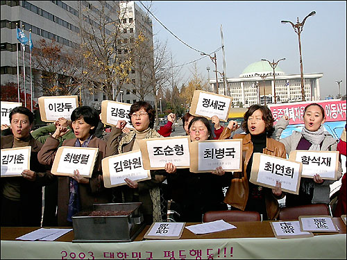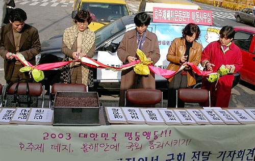 | ▲ 호주제폐지를 위한 평등행동을 결의한 각계각층의 다양한 여성들이 국회 앞에서 '2003 호주제폐지를 힘차게 외치고 있다. ⓒ 한국여성단체연합 | ||