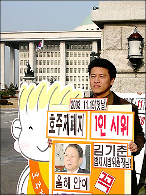 권해효, 유지나, 오한숙희, 홍석천, 이유명호, 김기식, 김제남 등 각계 각층의 호주제폐지 지지자들의 1인 시위가 매일 아침 9시부터 10시까지 국회 정문 앞에서 이어집니다. 특히 둘째 날은 호주제로 인해 피해를 받고 있는 재혼가정의 일반 시민 임정숙씨가 1인 시위에 동참하십니다.