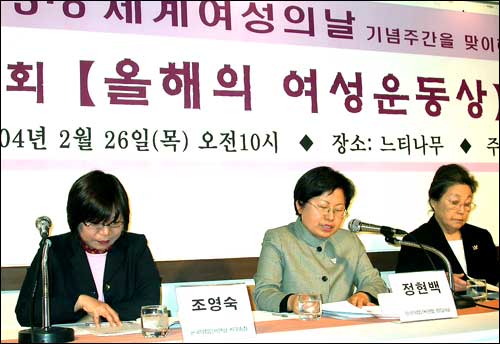 | ▲ 2004년 2월 4일 오전 10시 느티나무 카페에서 정현백(가운데) 여성연합 상임대표가 여성권익 디딤돌, 걸림돌을 발표하고 있다. 조영숙 여성연합 사무총장(왼쪽 끝)과 박영숙여성재단 이사장(오른쪽 끝) ⓒ 한국여성단체연합 | |