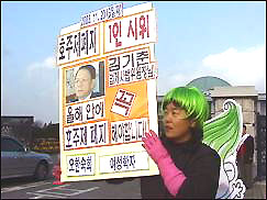 오한숙희씨는 도착하자마자 분홍색 고무장갑을 손에 끼고 머리에는 초록색 가발을 둘러썼습니다. 그러자 지나가던 시민들, 국회로 향하는 차 속의 사람들이 휘둥그레진 눈으로 <호주제폐지 1인 시위>를 주목했습니다.