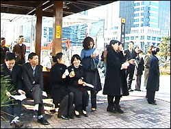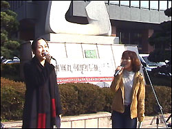 1인 시위를 끝내고, 점심 시간을 이용해서 <호주제 폐지, 희망의 노래>를 불렀습니다. 제가 직접 부른 것은 아니구요, 예전 노찾사 멤버셨던 유연이씨와 뮤지컬 명성황후에 출연하고 계시는 김가영씨께서 점심시간 여의도를 오가는 많은 시민들께 호주제폐지를 희망하는 여성노래, 대중가요를 선사했습니다. 24일 월요일에는 국회 앞 국민은행에서, 25일에는 여의도역에서 희망의 노래 행사가 있었는데 예상 외로 많은 시민들께서 뜨거운 반응을 보여주셨습니다.