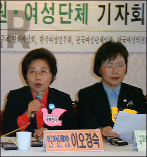 | ▲ 미국의 대이라크 전쟁 중단 및 한국군 파병반대를 촉구하는 여성국회의원·여성단체의 평화호소문을 낭독하고 있는 여성단체연합 이오경숙 대표 ⓒ 여성의전화연합 | |