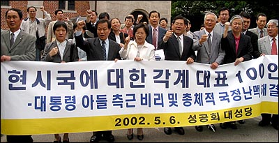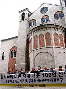 시민사회단체 종교계 등 각계대표들은 6일 오전 11시 서울 태평로 대한성공회 서울주교좌성당 마당에서 '현 시국에 대한 각계대표 100인 선언'을 발표하는 기자회견을 갖고 김 대통령의 아들·측근 비리와 총체적 국정 난맥상에 대해 강도 높게 비판했다.