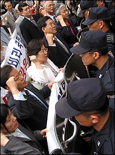| ▲ 시위대가 서울시의회 건물 앞에서 경찰의 저지를 받자 행진을 멈추고 대통령의 두아들에 대한 구속수사를 촉구하고 있다. ⓒ 오마이뉴스 조경국 | |