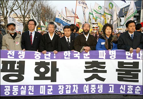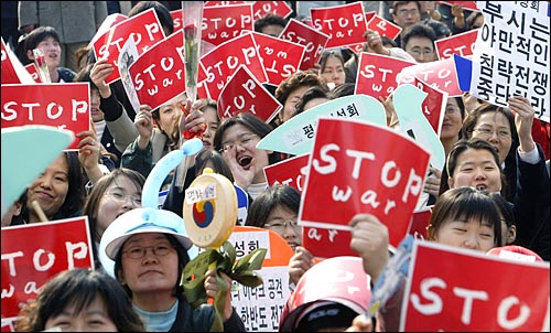"우리는 전쟁을 반대하고 파병을 반대한다. 평화를 사랑한다."