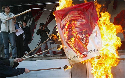 | ▲ 22일 오후 종묘공원에서 열린 반전평화촛불대행진에서 참가자들이 부시 미대통령을 풍자한 그림을 불태우고 있다. ⓒ 우먼타임스 장철영 | ||