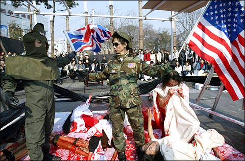 | ▲ 22일 오후 서울 인사동 입구 문화마당에서 무세중씨 등 대동통일극회 회원들이 미국의 이라크 침공을 규탄하는 내용의 퍼포먼스를 벌이고 있다. ⓒ 오마이뉴스 남소연 | ||