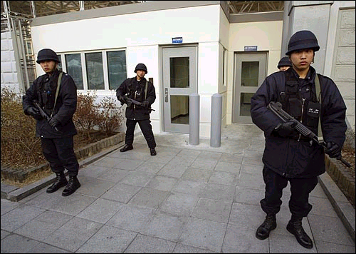 | ▲ 소총으로 무장한 경찰이 미대사관입구를 지키고 서 있다. ⓒ 오마이뉴스 권우성 | ||