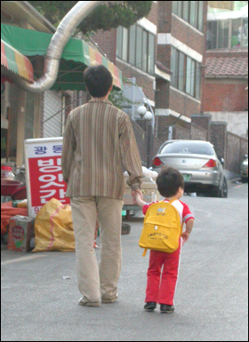 | ▲ 오후 5시가 지나면 일을 마친 부모들이 아이들을 찾으로 오기 시작한다. 아빠와 함께 집으로 돌아가는 아이. ⓒ 2005 박상규 | ||