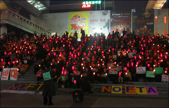 | ▲ 가두캠페인 후 세종문화회관 앞에서 열린 한미FTA졸속타결 반대 촛불문화제 ⓒ 한국여성단체연합 | |