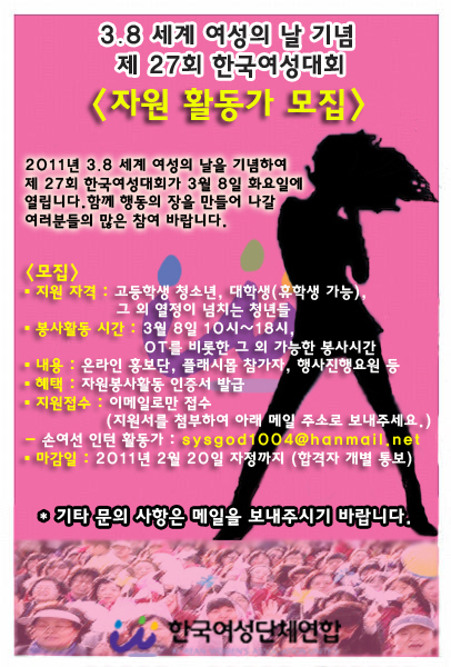| » | [자원활동가모집] 3.8 세계여성의날 기념 제27회 한국여성대회 | 2011.02.08 |