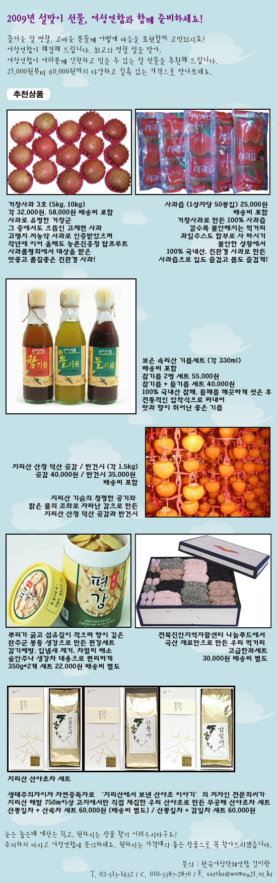 | » | 2009년 설맞이 선물, 여성연합과 함께 준비하세요! | 2008.12.05 |