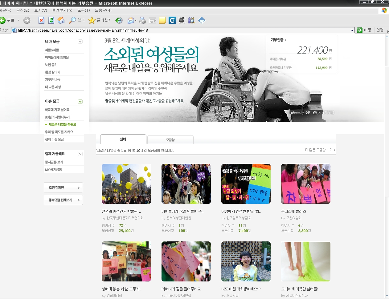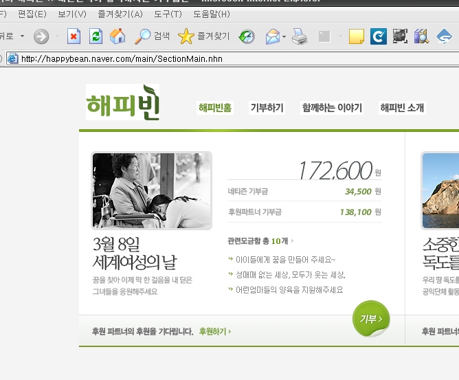 3월 8일 세계여성의날을 기념하여 해피빈 메인페이지에 <새로운 내일을 꿈꿔요>이슈 모금함으로 노출되었습니다.