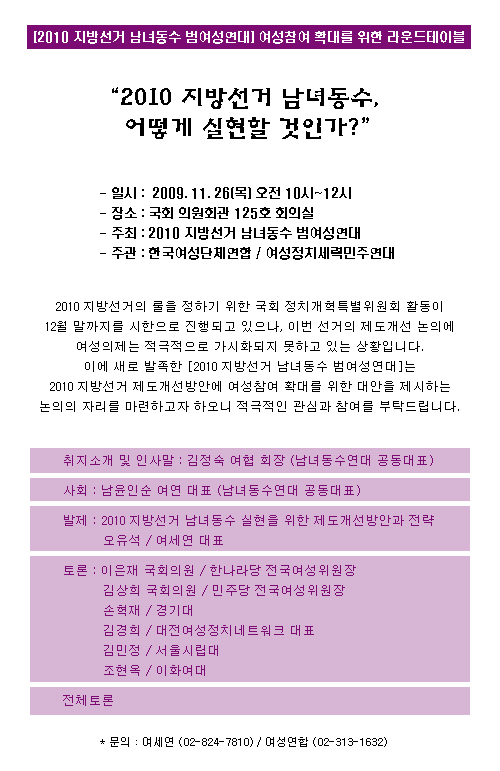 | » | 2010 지방선거 남녀동수, 어떻게 실현할 것인가? | 2009.11.24 |