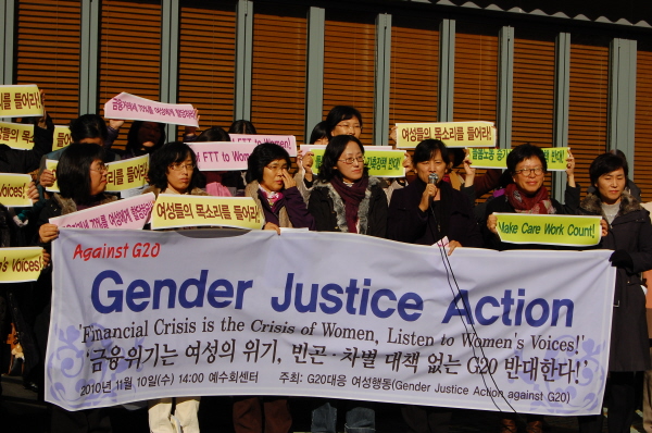 한국정부가 의장국이 되는 제5차 G20 정상회의는 세계경제위기 대응을 위한 책임 있는 정책 합의와 실천을 유보한 채‘개발(development)' 의제를 제안하여 저소득국을 위한 ’성장중심(Growth-oriented) 개발, 무역을 위한 원조(Aid for Trade)‘ 정책을 표방하고 있다. 국내외 시민사회 단체들은 10월 12일 G20 고위급 개발 컨퍼런스와 15일 Civil Dialogue를 통해 G20 의제에 성평등 관점을 통합하라는 제안을 공식적으로 전달했음에도 불구하고 G20 준비위원회는 ’G20 의제에 젠더는 고려대상이 아니라’는 입장을 고수하고 있다.