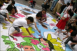 | ▲ 내가 꿈꾸는 평화 `공동그림판` 함께 꾸미기에 참여하고 있는 어린이들 ⓒ 한국여성단체연합 | |