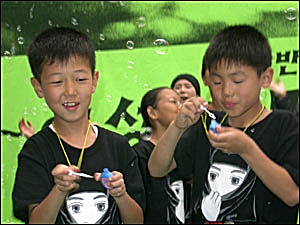 | ▲ 평화의 비누방울 날리기에 참여하여 즐거워하고 있는 어린이들 ⓒ 한국여성단체연합 | |