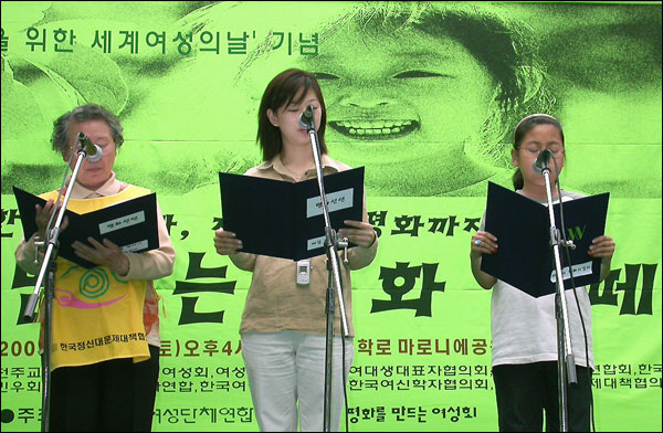 | ▲ 일본군위안부 출신 길원옥할머니와 여대생, 어린이가 나와 `평화지킴이와 함께 하는 평화 선언문 낭독장면 ⓒ 한국여성단체연합 | |