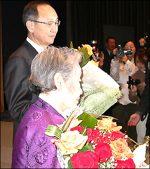 | ▲ 남측준비위의 백낙청 상임대표와 박용길 명예대표에게 축하의 꽃다발을 전하고 있다. ⓒ 한국여성단체연합 | ||