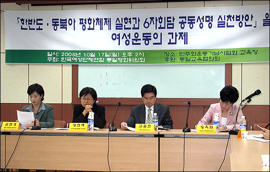 ‘6자회담 이후의 여성통일운동’을 주제로 발제에 나선 정현백 대표(한국여성단체연합 공동대표)는 “중국, 한국, 일본 여성들이 함께 6자회담의 성사를 지원하기 위한 캠페인을 시작하고 동북아 평화공동체 건설을 위한 활동을 전개하는 한편, 남북 간 긴장을 완화하고 화해와 평화를 이룩하기 위해 인도적인 지원과 함께 북측여성들과의 대화와 교류를 지속시킬 것”이라고 밝혔습니다.