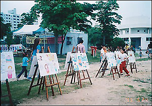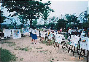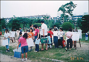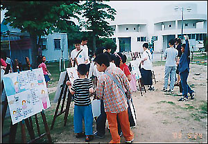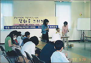 얼마 전 미국의 이라크침공이 끝나고 현지의 많은 피해 여성과 아이들을 보면서 우리단체에서는 5월 셋째 주를 여성평화주간으로 선정하여 반전과 평화를 담은 여러 가지 행사를 마련하였습니다. 종래의 사회교육센터 중심의 작은마을 축제(각종 전시회와 특강, 무료영화 상영등)에서 변화를 시도하여 개관행사는 물론, 방과후 아동교실인'샛별학교 교재교구 마련을 위한 일일만찬'을 열었으며 특히 평화주간의 메인행사로 5월24일은 약 200명의 어린이와 어머니가 참여한 가운데 평화그리기 대회가 이어졌어요. 갑작스런 기상변화에 엄청 당혹스럽기도 했지만 선생님들의 커다란 관심과 도움으로 잘 마무리했답니다. 사실 당일! 4시가 조금 넘어 비가 흩날리기 시작했거든요. . . 굳은 날씨에도 끝까지 성실하게 참여해주신 모든 참가자들에 진심으로 고마움을 표합니다.