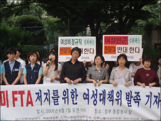 2006년 한국 사회는 신자유주의 구조조정이 마지막 단계에 이르면서 사회양극화가 갈수록 심화되고 있다. 이러한 상황에서 노동유연성의 절대화를 강요하는 한미FTA가 체결된다면 이미 비정규직 노동자의 대다수를 차지하고 있는 여성노동자의 삶은 더더욱 저임금의 하위직으로 전락할 것이고 여성의 빈곤화가 심해질것은 불을 보듯 뻔한 상황이다.